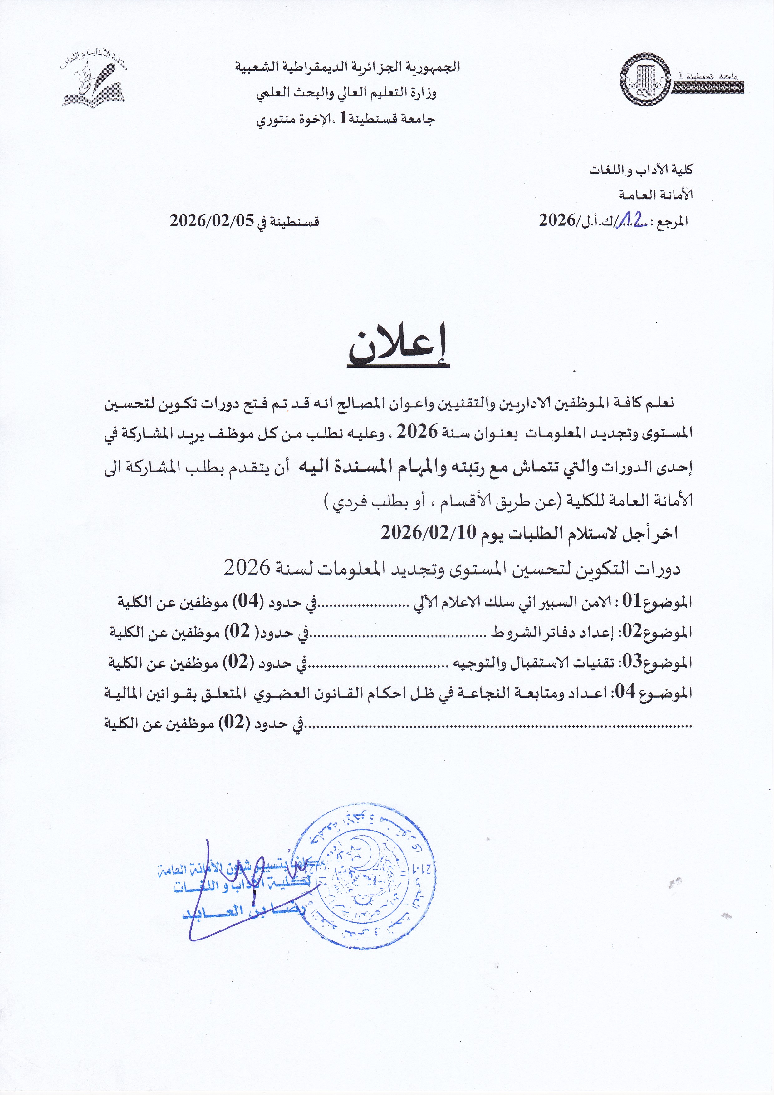 افتتاح دورات تكوينية لتحسين المستوى وتجديد المعلومات بعنوان سنة 2026 ................. نص الاعلان