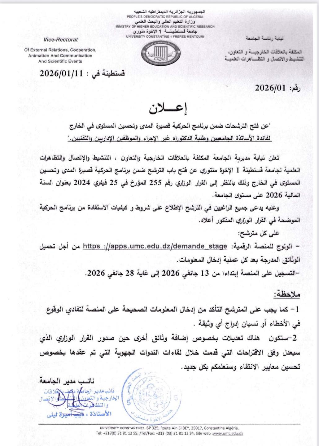 تُعلن نيابة الجامعة للعلاقات الخارجية إلى كافة الأساتذة وطلبة الدكتوراه والموظفين الإداريين والتقنيين عن فتح باب الترشح للحركية قصيرة المدى إلى الخارج لسنة 2026 عبر المنصة، وذلك ابتداءً من يوم الثلاثاء 13 جانفي 2026 إلى غاية 28 جانفي 2026.