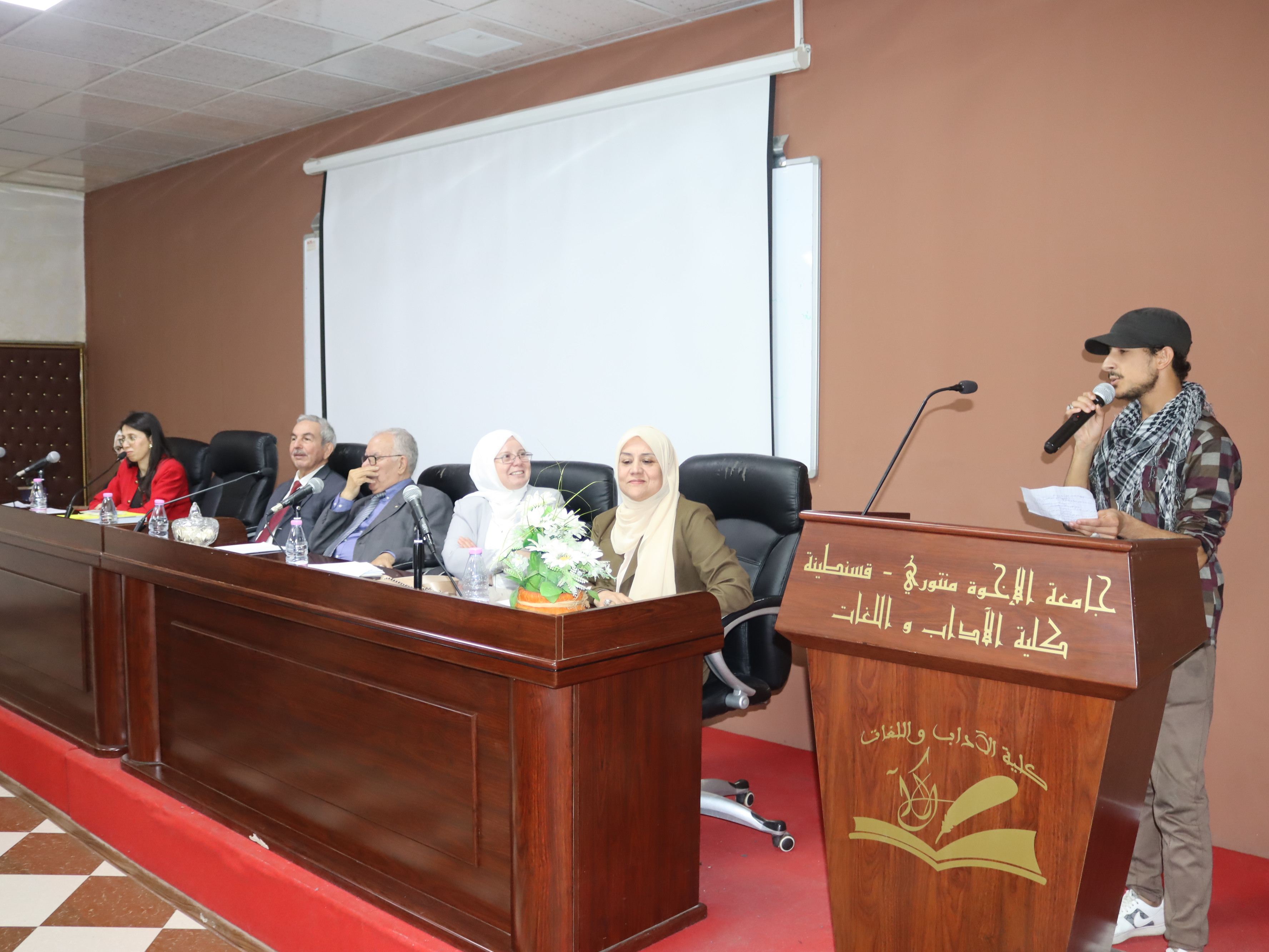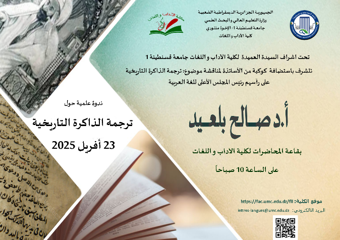 التي ناقشت إشكاليات نقل الذاكرة بين اللغات والثقافات، وإبراز التحديات التي تفرضها الترجمة على الروايات التاريخية والسرديات الجماعية. شارك في هذه الندوة نخبة من القامات والباحثين في مجالات التاريخ، لتبادل الرؤى وطرح إشكاليات جديدة تفتح آفاق البحث أمام المهتمين بهذا المجال الحيوي، على رأسهم رئيس المجلس الأعلى للغة العربية الاستاذ الدكتور صالح بلعيد لم يقتصر حضوره على المداخلة القيمة التي قدّمها، بل قام أيضًا، خلال زيارته، بإهداء عدد من الكتب القيّمة، دعمًا للمعرفة وتعزيزًا لرصيد مكتبة الكلية
