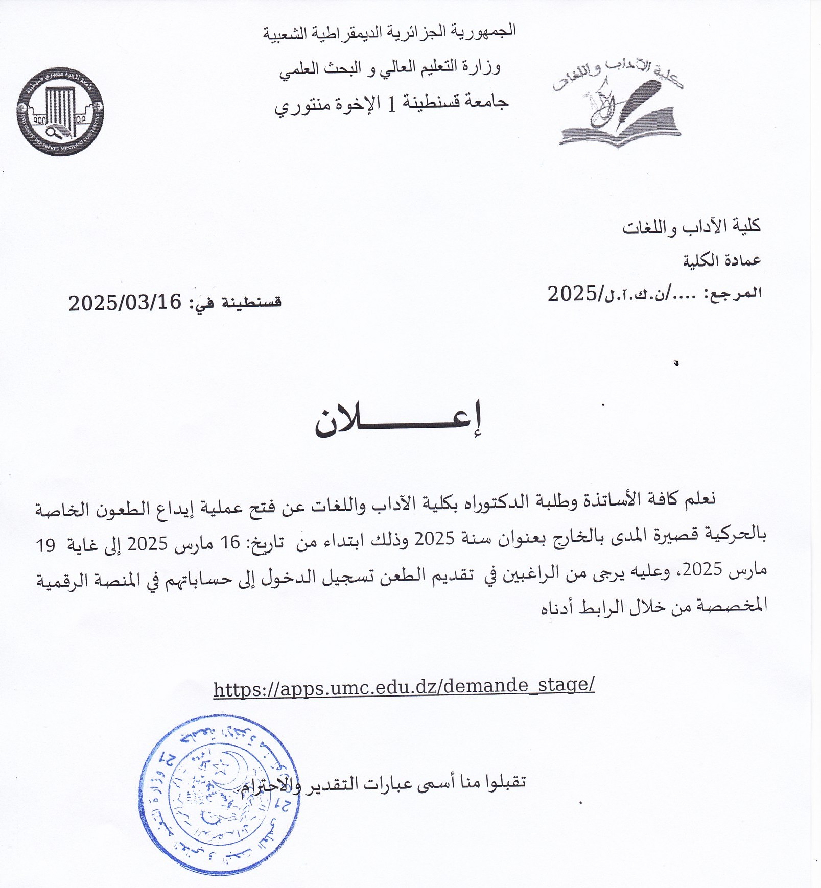 في إطار التحضير لتنظيم التظاهرات العلمية على المستويين الوطني والدولي لسنة 2026، يشرفني إبلاغكم بأنه سيتم فتح المنصة الرقمية المخصصة لهذا الغرض ابتداءً من 14 اكتوبر 2025 إلى غاية 01 نوفمبر 2025