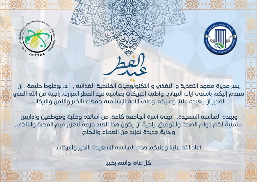 تهنئة مديرة المعهد البروفيسور بوغلوط حليمة بمناسبة عيد الفطر المبارك
