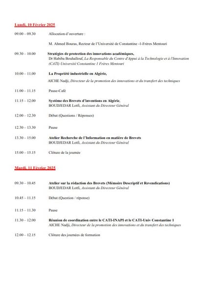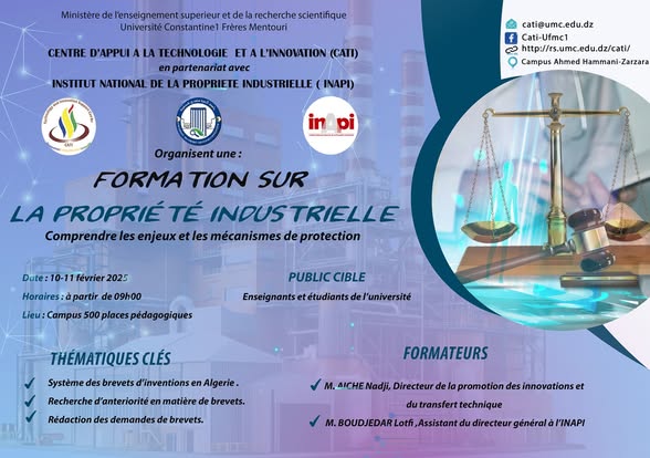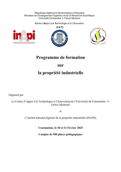 Nous avons le grand plaisir de vous inviter à participer à une formation sur la propriété industrielle, organisée par le le Centre d'Appui à la Technologie et à l'Innovation (CATI) en partenariat avec l'institut National Algerien de la Propriété Industrielle (INAPI).
