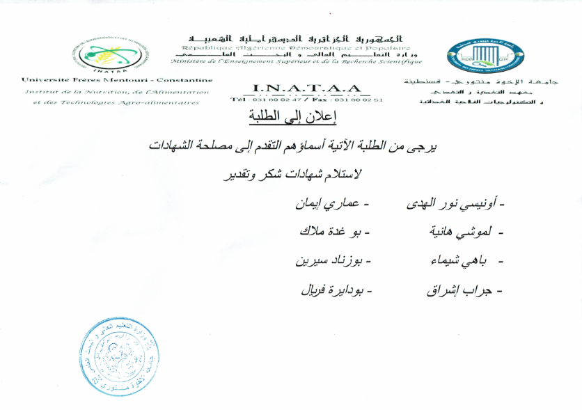 يرجى من الطلبة الآتية أسماؤهم التقدم إلى مصلحة الشهادات لاستلام شهادات شكر وتقدير