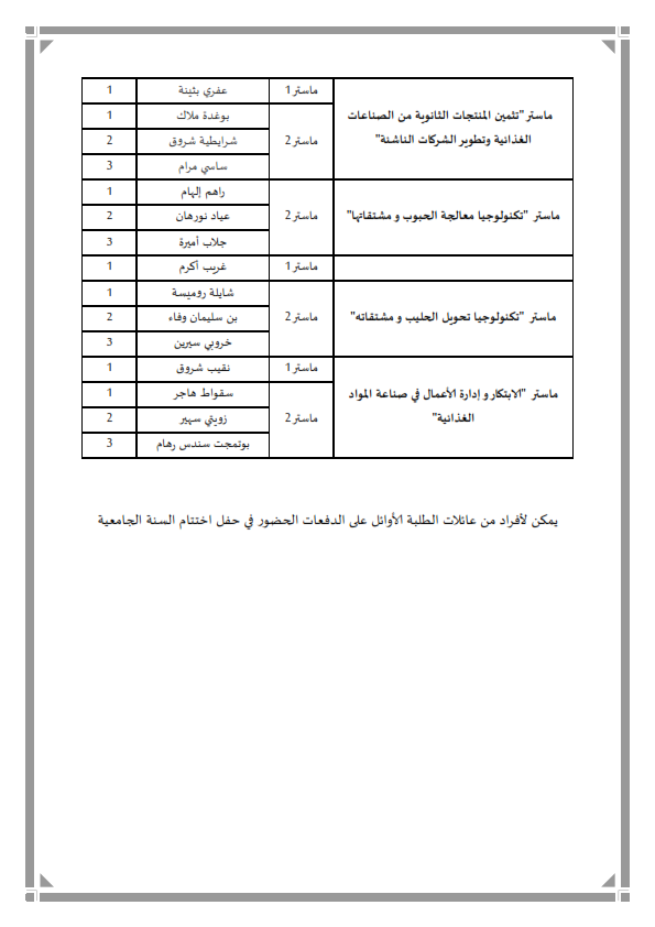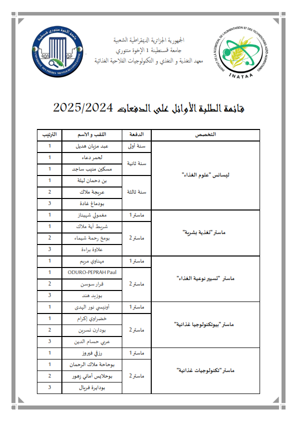 من أجل إتمام إجراءات حفل اختتام السنة الجامعية، يرجى من الطلبة الأوائل على الدفعات إرسال صورهم للبريد الإلكتروني التالي sdp.inataa@gmail.com
