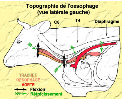 L'examen de l'œsophage est important en cas de troubles de la déglutition, de la rumination ou de l'éructation; les aliments tels que les pommes, les betteraves peuvent se bloquer au niveau de trois rétrécissements :